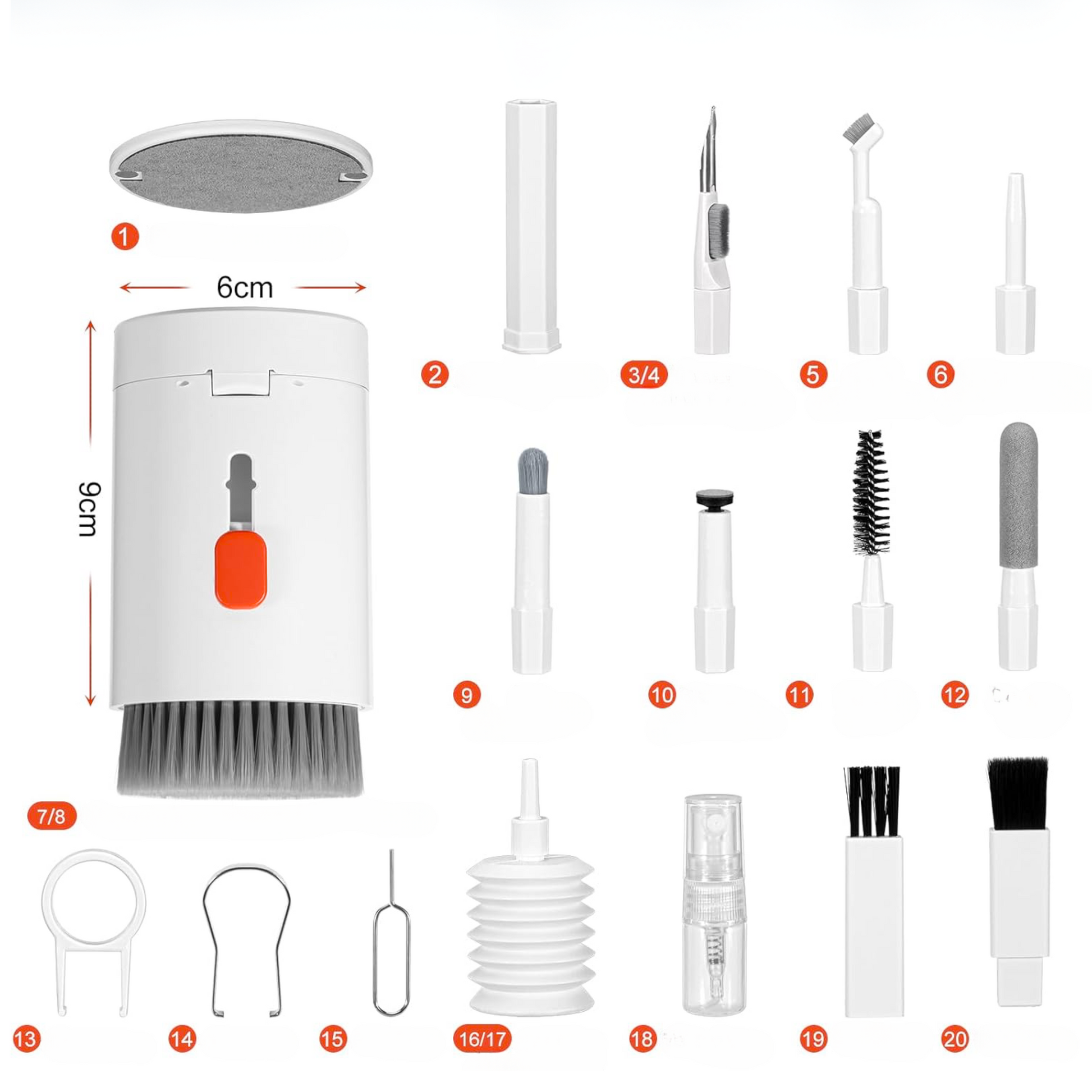 Sparkkit™ Komplet za čiščenje je pametna in popolna rešitev za čiščenje vašega SnapStick™, tipkovnice, slušalk, prenosnika in druge elektronike. Z 21 praktičnimi orodji – vključno s silikonskimi konicami, flanelskimi krpami, izvlečki za tipke, ščetkami in gobicami – enostavno odstranite prah, umazanijo in madeže tudi v najgloblje kotičke.
